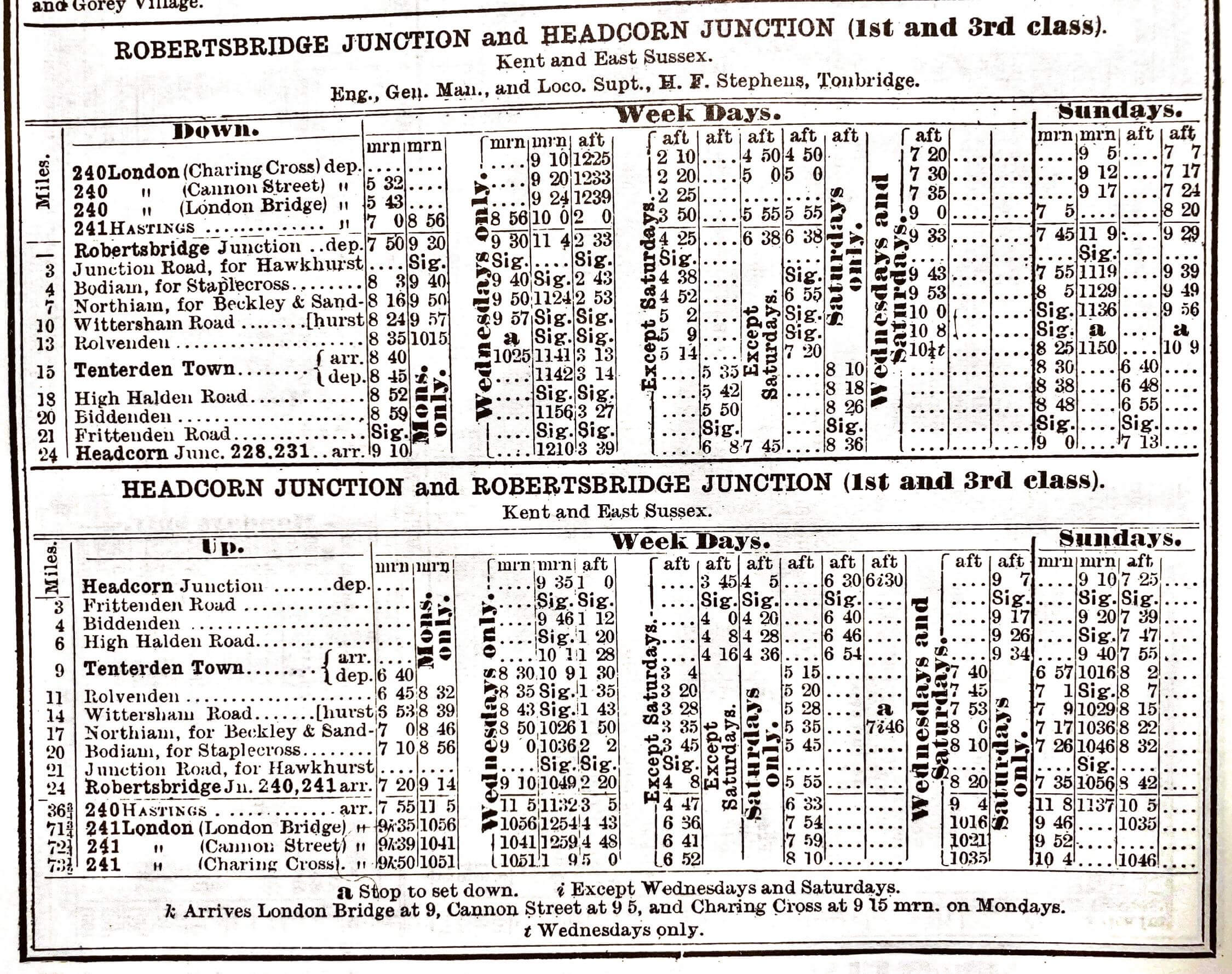 The railway closed to regular passenger services on the 2 January 1954, and the Tenterden to Headcorn section was lifted in 1955. Freight services continued between Robertsbridge and Tenterden until June 1961, when the line was closed completely, except for the short section between the main line and Hodsons Mill at Robertsbridge, which survived as a private siding until 1969.