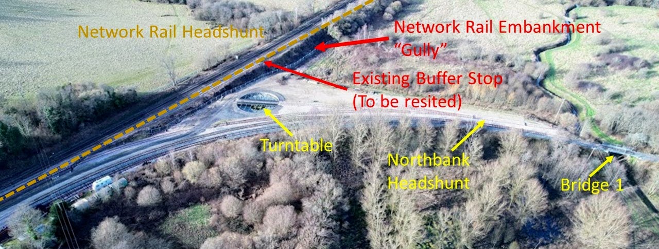 The illustration above shows visiting locomotive “Britannia” at Robertsbridge in May 2024, sat on the historic ex-Hither Green turntable, already installed on-site, along with the new railway tracks. An artists impression adds a board idea of the new locomotive shed to be built alongside.
